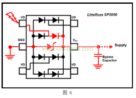 至于常用 TVS 二極管陣列、5 針、VCC 的中其余引腳,Littelfuse 還建議,這應(yīng)連接到本地電源,如 5V,3.3V等(注:應(yīng)當(dāng)心,以確保保護(hù)裝置或 VRWM 的對(duì)峙電壓遠(yuǎn)高于電源電壓,以防止激活或打開內(nèi)部 TVS 二極管。)