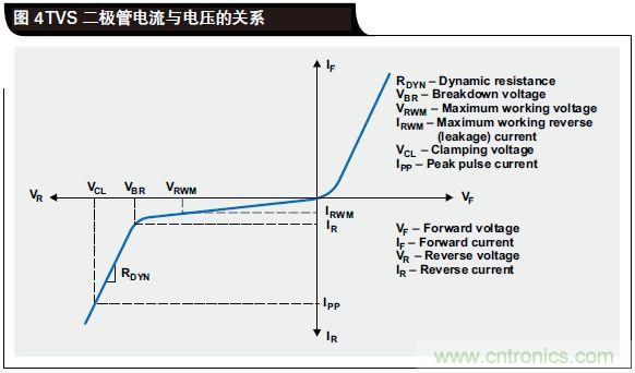 圖 4 顯示了 TVS 二極管電流與電壓特性的對(duì)比情況。盡管 TVS 是一種簡(jiǎn)單的結(jié)構(gòu),但是在系統(tǒng)級(jí) ESD 保護(hù)設(shè)計(jì)過程中仍然需要注意幾個(gè)重要的參數(shù)。這些參數(shù)包括擊穿電壓 VBR、動(dòng)態(tài)電阻 RDYN、鉗位電壓 VCL 和電容。