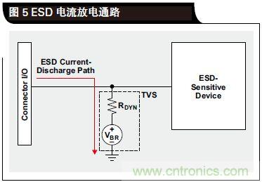 ESD 是一種極速事件,也就是幾納秒的事情。在如此短的時(shí)間內(nèi),TVS 傳導(dǎo)接地通路不會(huì)立即建立起來,并且在通路中存在一定的電阻。這種電阻被稱作動(dòng)態(tài)電阻(RDYN),如圖 5 所示。