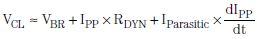 由于ESD是一種極速瞬態(tài)事件,I/O路線的電壓不能立即得到鉗制。如圖6所示,根據(jù)IEC 61000-4-2標(biāo)準(zhǔn),數(shù)千伏電壓被鉗制為數(shù)十伏。如方程式1所示,RDYN越小,鉗位性能也就越好:其中,IPP為ESD事件期間的峰值脈沖電流,而Iparasitic為通過TVS接地來自連接器的線路寄生電感。