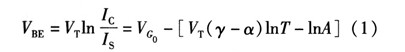 式中VG為帶隙電壓,γ和α為器件參數(shù),A代表了那些方程推到過程中與溫度無關的常量。因為Vt=kt/q,可以得到VBE隨溫度上升是降低的。其關于溫度變化的方程為