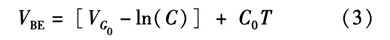 如果忽略由溫度變化引起lnT項變化對式(2)的影響,dVBE/dT可近似等于常數(shù)C0。常溫下C0約為-2 mV/K。為了簡化計算,則PN結關于溫度的變化方程可近似線性為![]()