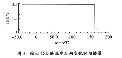按照以上設計的電路。用Cadence Specture對其進行仿真,器件的模型參數(shù)采用0.35μm CMOS工藝。圖2為過溫保護電路的輸出控制信號TSD,隨溫度上升和下降的曲線。電源電壓取3.3 V。從仿真結果可以看出,該電路實現(xiàn)了良好的“溫度遲滯”特性。遲滯功能有效的避免了芯片出現(xiàn)熱振蕩問題。關斷溫度TH160°和恢復溫度TL140°。