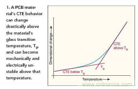 圖1:PCB材料的熱膨脹系數(CTE)特性在高于材料的玻璃化溫度Tg時會發生急劇變化,并且在機械和電氣方面變得不穩定