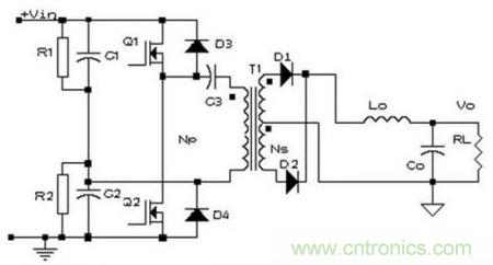 電容器C1和C2與開關管Q1、Q2組成橋,橋的對角線接變壓器T1的原邊繞組,故稱半橋變換器。如果此時C1=C2,那么當某一開關管導通時,繞組上的電壓只有電源電壓的一半。
