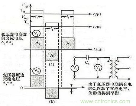 如果要這種不平衡的波形驅動變壓器,將會發生偏磁現象,致使鐵心飽和并產生過大的晶體管集電極電流,從而降低了變換器的效率,使晶體管失控,甚至燒毀。