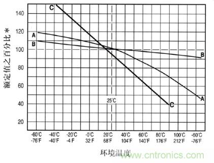 如圖所示為溫度降額曲線,以曲線A為例,在溫度為80℃時,Tf為0.75。因此,若不考慮其他特性的影響,對3A的應用,至少應選擇4A(3/0.75=4)的保險絲。