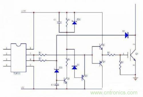 所以IGBT的短路保護(hù)一般是配合過載保護(hù)的,下面是一個TLP250增加慢降柵壓的驅(qū)動和短路保護(hù)的應(yīng)用電路圖: