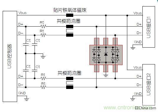 圖1:具有靜電放電保護功能的雙端口USB端口
