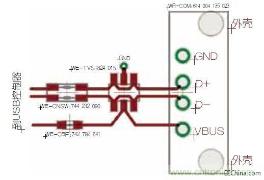 從圖3可以明顯看出,有兩條差分信號線(D+和D-)從插頭連接器連接到TVS二極管,再通過電流補償式數據線扼流圈連接到USB控制器。這樣能夠得到出色的靜電放電保護功能,并能良好的抑制數據線對。VBUS通過TVS二極管路由到貼片磁珠。在貼片磁珠之后,可以插入額外的電容和另一個貼片磁珠來實現最大可能的PI濾波器衰減。