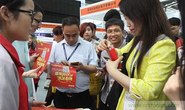 電子商務平臺的崛起,也使得營銷手段更加花樣百出地貼近消費者,再也不是以前坐等顧客上門挑選的被動局面,分銷商在展館里可謂是使出十八般武藝,力圖能激起消費者翻牌的欲望。這不,原先四處走動的觀眾,瞬間被抽中一百塊現金紅包的歡呼聲給吸引了過去,筆者也前往一探究竟,原來是華強電子網的展位上進行的免費認證超級買家抽紅包的活動。