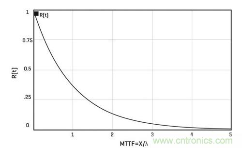 這是因?yàn)椋哂泻愣ü收下实墓收嫌梢粋€(gè)指數(shù)因子表征,如以下等式所示,用于計(jì)算元器件在給定時(shí)間后沒有發(fā)生故障的可能性:R(t) = e-λt