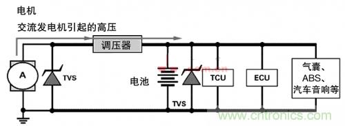 現代汽車設計中,所有車載電子設備都要連接電池和交流發電機。交流發電機是電氣瞬態的主要來源,其中最 糟的是拋負載。這種情況發生在電池已經斷開而交流發電機正在發電、其他負載還在交流發電機環路上時。如果置之不理,電氣尖峰和瞬態將沿著電線傳遞,導致個別電子設備和傳感器故障,或永久損壞汽車的電子系統。當然,拋負載失控還會威脅車輛本身的安全性和可靠性。