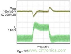 LTC3895 用一款帶寬為 25MHz 的快速運算放大器實現輸出電壓反饋。該放大器的大帶寬與高開關頻率和低電感值的電感器相結合,允許非常高的交叉頻率增益。這就允許針對非??斓呢撦d瞬態響應優化補償網絡。圖 3 說明了在 12V 輸出時 2A 階躍負載的瞬態響應,與標稱值的偏離不到 100mV,恢復時間為 200µs。