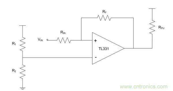 下面的例子所示為安森美半導體TL331配置為一個反相施密特觸發器。L331是無內部滯回的單通道、低功耗、集電極開路的比較器。由R1和R2電阻創建的電阻分壓器在非反相引腳上設置參考電壓,在比較器輸出開關處設置閾值電壓。由于這是一個集電極開路的比較器,所以連接一個上拉電阻到輸出。反饋電阻通過正反饋增加滯回。通常情況下,使用一個比較大的反饋電阻值,至少100 KΩ。