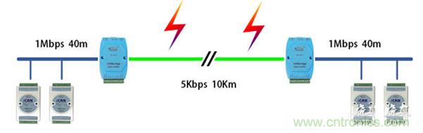 傳導(dǎo)防護(hù)主要是在傳輸線上進(jìn)行的。CAN總線的數(shù)據(jù)傳輸介質(zhì)一般為雙絞線,它主要的作用是抗低共模干擾,但是在面對(duì)浪涌、雷擊等情況時(shí)不僅沒有防護(hù)作用,反而易造成節(jié)點(diǎn)設(shè)備的損壞。因此,具備室外環(huán)境、長(zhǎng)傳輸距離、多節(jié)點(diǎn)設(shè)備特點(diǎn)的總線一般都要加隔離防護(hù)功能的網(wǎng)橋、