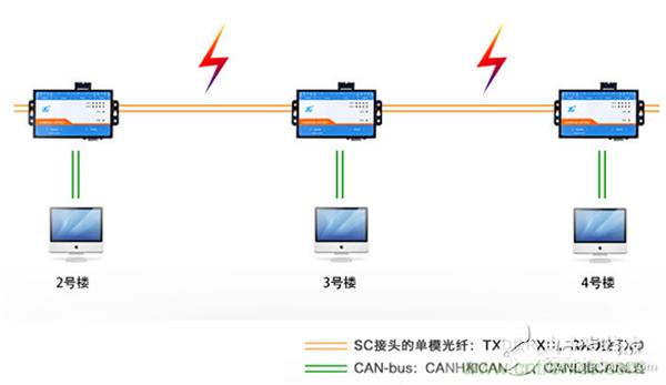 有沒有方法能徹底解決雷擊造成的隱患呢?答案是肯定的,只要數(shù)據(jù)的傳輸不依賴電信號(hào)就能完全隔離掉雷擊的危害。我們可以把CAN總線室外的部分或者說(shuō)容易受到干擾的部分使用光信號(hào)傳輸,這種方法目前已經(jīng)廣泛應(yīng)用于高速鐵路、地鐵、煤礦、醫(yī)療、航空航天、樓宇安防、電梯控制等場(chǎng)合。