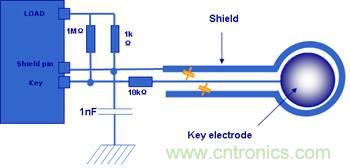 在STM8S的解決方案中,ST提供了感應電極和走線的設計規(guī)范和如圖3所示的Driven Shield功能(在Shield線上提供與按鍵管腳相同的驅動信號,電極與Shield之間的寄生電容就不會被充放電),能有效地減少感應電極走線的寄生電容對按鍵靈敏度的影響。
