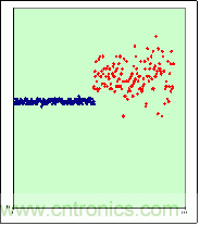 因為國內電網(wǎng)質量不一,在一些質量差的地區(qū),容易影響電磁爐觸摸按鍵的正常工作。如果不能做電源隔離,就會看到一下圖6的差別(藍色表示無按鍵,紅色表示鍵被按下),而這些圖還只是在電磁爐沒有開功率的情況下的,當電磁爐工作時產生的電磁輻射將會使看到的信號更加雜亂無章。在實驗中發(fā)現(xiàn),采用與外界電網(wǎng)隔離或使用軟件濾波,按鍵效果都能得到明顯改善。
