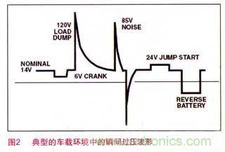 車載環(huán)境中電源電路中的瞬間過(guò)壓包括:負(fù)載突降(Load Dump)、跳變開始(Jump Start)以及各種各樣的電壓噪聲。如圖2所示。其中拋負(fù)載過(guò)壓是車載環(huán)境中最嚴(yán)重的瞬間過(guò)壓,在12V車載系統(tǒng)中,其瞬間過(guò)壓可達(dá)125V。