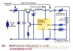 由于PolySwitch器件快速而有效地將過(guò)電流限制到安全水平,且體型小巧,可直接貼裝到電路板,因此,可使用該器件對(duì)PND內(nèi)的每條電源電路進(jìn)行一對(duì)一的保護(hù)。圖3為使用了PolySwitch電路保護(hù)器件的便攜式電子設(shè)備中的電池充電電路典型結(jié)構(gòu)圖。PolySwitch和鉗位二極管共同保護(hù)設(shè)備不受過(guò)電壓、極性反轉(zhuǎn)等故障的損害,保護(hù)汽車電源及電路不因便攜式電子設(shè)備內(nèi)部故障而損壞。