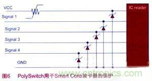 接觸式Smart Card內(nèi)部有一個(gè)IC芯片,用于傳輸信息、存儲(chǔ)數(shù)據(jù)等。Smart Card工作時(shí),由讀卡器的Vcc電壓供電。損壞的Smart Card或者其他導(dǎo)電物品被錯(cuò)誤地放進(jìn)讀卡器,都有可能造成讀卡器電路出現(xiàn)短路,而造成永久損壞。在讀卡器電路中使用PolySwitch可恢復(fù)器件能夠?qū)Υ祟愲娐饭收线M(jìn)行保護(hù)。如圖6,在讀卡器的Vcc供電電路中串聯(lián)PolySwitch器件,當(dāng)出現(xiàn)短路過(guò)電流故障時(shí),PolySwitch器件能夠切斷電路,在故障排除后恢復(fù)電路,并在所有端口進(jìn)行ESD防護(hù)。