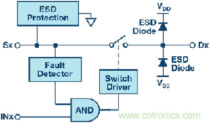 圖2顯示了一個(gè)典型過壓保護(hù)開關(guān)的功能框圖;注意,該開關(guān)的ESD保護(hù)二極管未以其輸入節(jié)點(diǎn)上的電源電壓為基準(zhǔn)。相反,它有一個(gè)ESD保護(hù)單元,在超過器件最大承受電壓時(shí)激活,使器件能承受并阻斷超過其電源電壓的電壓。由于模擬系統(tǒng)通常只要求開關(guān)的外向引腳采用IEC保護(hù),所以,ESD保護(hù)二極管依然保留在內(nèi)向引腳上(標(biāo)志為開關(guān)輸出端或漏極端)。這些二極管能帶來額外的好處,因?yàn)樗鼈兤鸬捷o助保護(hù)器件的作用。在持續(xù)時(shí)間較短、上升時(shí)間快的高壓瞬變(如ESD或EFT)過程中,由于瞬變電壓會(huì)被箝位,所以電壓不會(huì)到達(dá)下游電路。在持續(xù)時(shí)間較長、上升時(shí)間慢的高壓瞬變(如浪涌)過程中,在開關(guān)過壓保護(hù)功能被激活、開關(guān)斷開、使故障完全與下游電路分離之前,內(nèi)部保護(hù)二極管會(huì)箝位開關(guān)的輸出電壓。