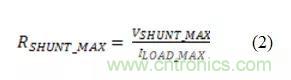計算最大分流電阻。當來自負載(ILOAD)的電流流過分流電阻器(RSHUNT)時,分流電阻器上會形成一個電壓電位(VSHUNT)。VSHUNT被視為系統負載的“接地端”。因此,建議將VSHUN的最大負載電流保持在100mV以下,以避免在與其它具有真正0V接地的系統連接時出現問題。公式2用于計算RSHUNT值:
