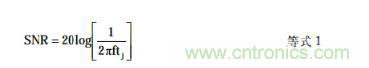 ADC寬帶孔徑抖動(dòng)tj、轉(zhuǎn)換器SNR和滿量程正弦波模擬輸入頻率 f之間的關(guān)系如下: