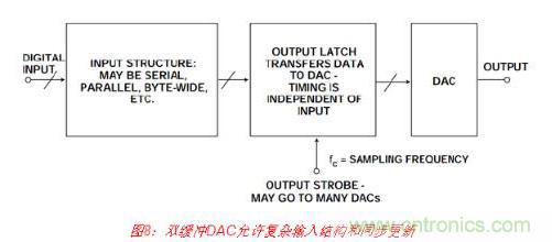 DAC輸入結(jié)構(gòu)存在無(wú)數(shù)變化形式,本文將不一一介紹,但幾乎所有都稱為“雙緩沖”。栓 緩沖DAC具有兩組鎖存器。數(shù)據(jù)最初鎖存在第一級(jí)中,然后傳輸?shù)降诙?jí),如圖8所示。 這種配置非常有用,具體有以下幾種原因。