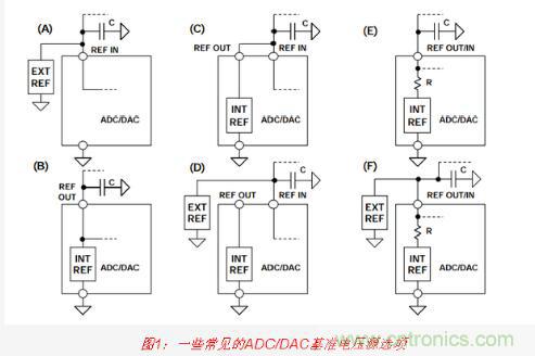 各種各樣的ADC和DAC以各種各樣的方式支持使用外部基準(zhǔn)電壓源來(lái)替代內(nèi)部基準(zhǔn)電壓源。圖1所示為一些常見(jiàn)配置(但顯然并不是全部)。