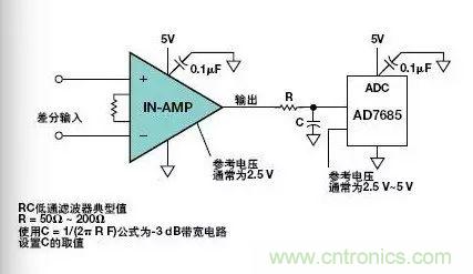 圖7.儀表放大器驅(qū)動ADC的典型單電源電路