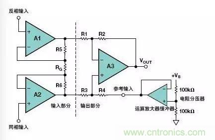 圖9.利用低輸出阻抗運算放大器驅(qū)動儀表放大器的參考電壓輸入端
