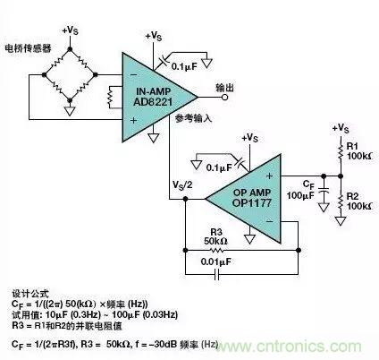 上面示出的CF試用值能夠提供大約0.03 Hz的–3 dB極點頻率。接在R3兩端的小電容器(0.01 μF)可使電阻器噪聲最小。