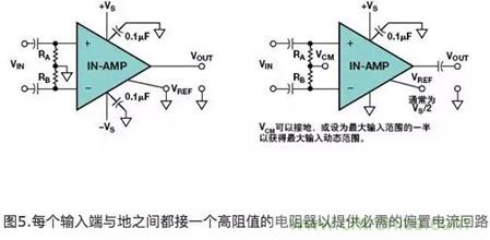 這兩只電阻器為輸入偏置電流提供了一個放電回路。在圖5所示的雙電源例子中,兩個輸入端的參考端都接地。在圖5b所示的單電源例子中,兩個輸入端的參考端或者接地(VCM接地)或者接一個偏置電壓,通常為最大輸入電壓的一半。