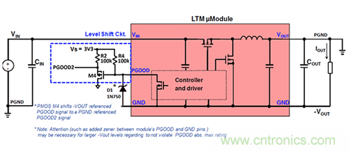 PGOOD輸出引腳指示μModule穩壓器輸出電壓是否處于穩壓(PGOOD高電平)范圍內(PGOOD低電平)。模塊內部PGOOD引腳是開漏MOSFET,因此需要一個上拉電阻來提供偏置電壓。如果要在負輸出配置中使用PGOOD功能,μModule穩壓器看到的PGOOD信號必須適當地電平移動到PGND參考信號,以供系統進一步使用。