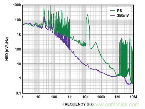 當裕量為 350 mV 時,LDO 采用壓差工作模式。此時,LDO 再也不能調節輸出電壓,充當一個電阻,輸出噪聲升至近 76 μVrms,如圖 9 所示。只有 FET 的 RDSON和輸出端的電容形成的極點衰減輸入噪聲。