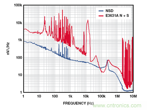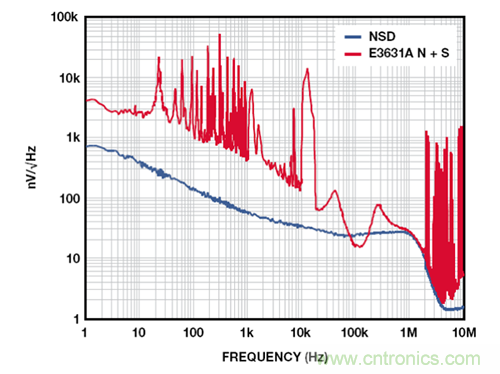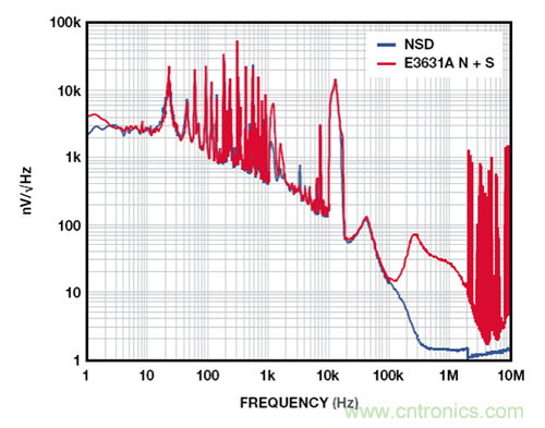 圖 4 展示的是 2.5 V ADM7160 在 500 mV 裕量和 100 mA 負載條件下,相對于 E3631A 臺式電源的輸出噪聲,該臺式電源在 20 Hz至 20 MHz 范圍內的額定噪聲低于 350 μV-rms。1 kHz 以下的許多雜散為與 60 Hz 線路頻率整流相關的諧波。10 kHz 以上的寬雜散來自產生最終輸出電壓的 DC-DC 轉換器。1 MHz 以上的雜散源于環境中與電源噪聲不相關的 RF 源。在 10 Hz 至 100 kHz范圍內,這些測試所用電源的實測噪聲為 56 μV rms,含雜散為104 μV。LDO 抑制電源上的所有噪聲,輸出噪聲約為 9 μV-rms。