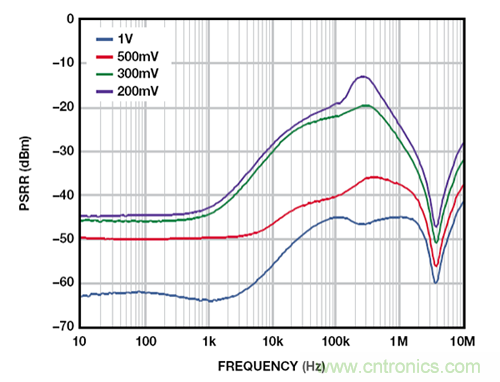 LDO 電源抑制比(PSRR)與裕量電壓相關——裕量電壓指輸入與輸出電壓之差。對于固定裕量電壓,PSRR 隨著負載電流的提高而降低,大負載電流和小裕量電壓條件下尤其如此。圖 1 所示為 ADM7160 超低噪聲、2.5 V 線性調節器在 200 mA 負載電流和 200 mV、300 mV、500 mV 和 1 V 裕量電壓條件下的 PSRR。
