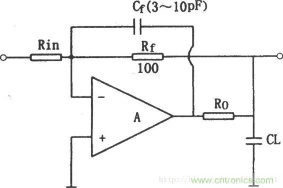 對于許多集成運算放大電路,若輸出負(fù)載電容CL的值比100pF大很多,由于輸出電容(包括寄生電容)與輸出電阻將造成附加相移,這個附加相移的累加就可能產(chǎn)生寄生振蕩,使放大器工作嚴(yán)重不穩(wěn)定。解決這一問題的方法是在運放的輸出端串聯(lián)一個電阻Ro,使負(fù)載電容CL與放大電路相隔離,如圖所示,在Ro的后面接反饋電阻Rf,這樣可以補償直流衰減,加反饋電容Cf會降低高頻閉環(huán)電壓放大倍數(shù),Cf的選取方法是:使放大電路在單位增益頻率fT時的容抗Xcf≤Rf/10,又Xf=l/(2πfTCf),一般情況下,Ro=50~200Ω,Cf約為3~10pF。
