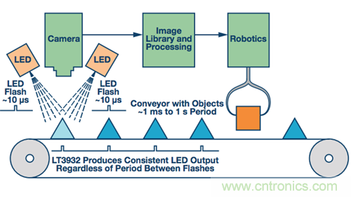 幸運的是,LT3932高速LED驅動器可為高達2 A的LED串提供機器視覺相機閃光燈,關斷時間可以長達1秒、1小時、1天或更長時間。LT3932的特殊相機閃光燈功能允許其保持輸出電容和控制環路充電狀態,哪怕是在長關斷時間內。對輸出和控制環路電容的狀態進行采樣后,LT3932繼續在長關斷期間對這些元件進行涓流充電,以補償通常都會有的漏電流,而這是其他LED驅動器未予考慮的。