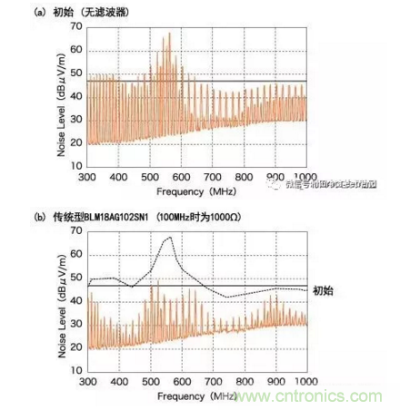 傳統型BLM18AG對300MHz和700MHz之間頻率范圍內的噪聲抑制十分有效。