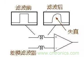 共模濾波器和差模濾波器對(duì)差模信號(hào)濾波效果對(duì)比,差模濾波器在濾出疊加在信號(hào)上的噪聲后導(dǎo)致波形失真。