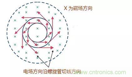 如圖是螺旋線圈中磁場和電場的關(guān)系示意圖,電場方向是沿線圈圓周的切線方向,而磁場在圖中是垂直穿過。