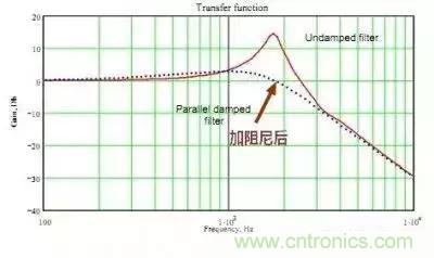 可以看出,截止頻率處的尖峰被壓平,也就是說不再使得噪聲被放大。其中電容 Cd 對(duì)阻尼不起作用,只是為了隔離輸入電壓以避免電阻產(chǎn)生
