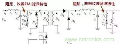 這是一個(gè)正激電源,請?zhí)貏e注意,輸入LC的EMI濾波器和輸出的紋波濾波器都有一個(gè)電容串聯(lián)電阻的阻尼電路,阻尼作用前面已多次提及。特別注意輸出端的阻尼電路,曾經(jīng)見過帖子問為何在電解電容上串聯(lián)一個(gè)電阻,但似乎都沒有人知道為什么,請記住這是為了改善紋波性能加上的阻尼電路,有了這個(gè)阻尼電路課大大改善紋波性能。道理同EMI濾波器的阻尼相同。