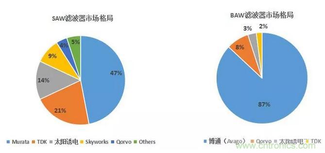 從全球范圍來看,SAW濾波器的主要供應商包括TDK-EPCOS、Murata(村田)和太陽誘電,三者合計占據了全球82%的市場份額。BAW濾波器的主要供應商包括Avago及Qorvo(Triquint),兩者占據了全球95%以上的市場份額。