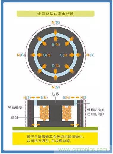 當電感器附近存在屏蔽罩等磁性體時,磁性體會因電感器漏磁通影響產(chǎn)生振動,從發(fā)生嘯叫。