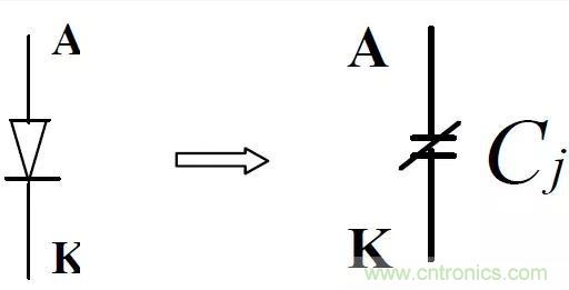 二極管反向截止時可用一電容等效,其容量與所加的反向電壓、環境溫度等有關,大小可從制造商的手冊中獲得。
