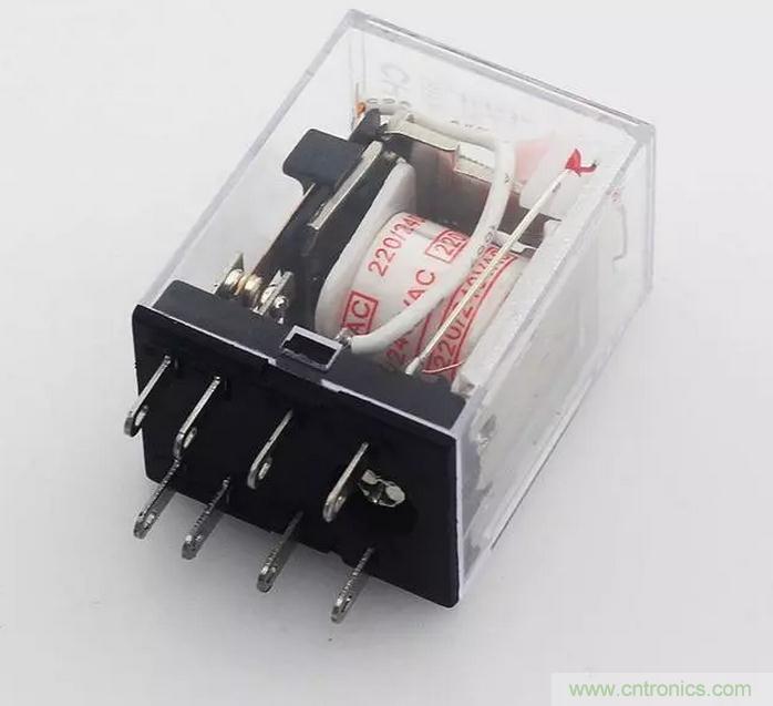 中間繼電器一般有2對(duì)觸點(diǎn)的和4對(duì)觸點(diǎn)的,下圖為4對(duì)觸點(diǎn)的中間繼電器: